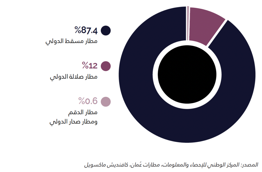تركزت حركة المسافرين القوية عبر شبكة المطارات العﻤﺎنية في مطار مسقط الدولي، الذي استقبل حوالي 9.8 مليون مسافر ( 87.4 %)، ما يؤكد دوره الحيوي بوصفه البوابة العالمية الرئيسية للسلطنة في مجال السفر الجوي بقصد العمل والترفيه. وتبوأ مطار صلالة الدولي المركز الرئيسي الثاﻧﻲ، حيث استقبل حوالي 1.4 مليون مسافر %12 )، مدعوماً بجاذبية صلالة الكبﻴﺮة في مجال الترفيه، لا سيﻤﺎ خلال موسم الخريف، الذي اجتذب نسبة 21.3 % تقريباً من إجﻤﺎلي عدد المسافرين في المطار.