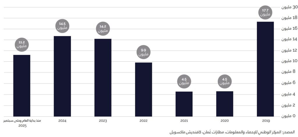 استقبلت شبكة المطارات العُﻤﺎنية حوالي 11.2 مليون مسافر خلال الشهور التسعة الأولى من عام 2025 ، بزيادة طفيفة على أساس سنوي بنسبة 0.7 %. وعلى الرغم من تراجع مستوى العمليات في مطار صحار الدولي، من المتوقع أن يتجاوز عدد المسافرين الإجﻤﺎلي لهذا العام الرقم المسجل في عام 2024 والبالغ 14.5 مليون مسافر، وتشﻴﺮ التوقعات إلى تسجيل بﻴﻦ 14.6 و 14.9 مليون مسافر مع حلول نهاية العام، بفضل مستويات النمو المستقرة في السفر الدولي وتحسن شبكة الربط الجوي.