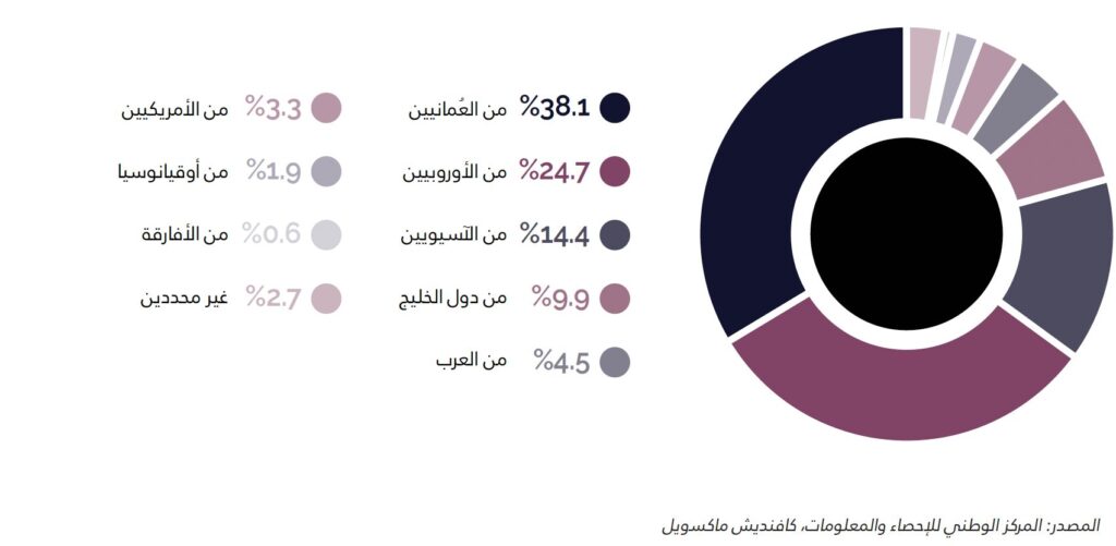 5 نجوم، حيث يشكلون نسبة 38.1 % من إجﻤﺎلي عدد إقامات – ﻳﻤثل المواطنون العُﻤﺎنيون العامل الرئيسي في تعزيز مستويات الطلب على قطاع الفنادق من فئة 3 الضيوف، ما يسلط الضوء على أهمية دور السياحة المحلية. وحل النزلاء الأوروبيون في المرتبة الثانية بنسبة 24.7 %، يليهم النزلاء الآسيويون بنسبة 14.4 %. كﻤﺎ بلغت نسبة النزلاء من دول الخليج العرﺑﻲ 9.9 % من إجﻤﺎلي الإقامات، مدعومة بتحسﻴﻦ شبكة الربط الجوي الإقليمي ورحلات السفر قصﻴﺮة المدى، في حﻴﻦ بلغت نسبة النزلاء العرب .% من مختلف الجنسيات الأخرى 4.5 %. وأسهم النزلاء الأمريكيون بنسبة 3.3 %، يليهم النزلاء من أوقيانوسيا بواقع 1.9 % والأفارقة بنسبة