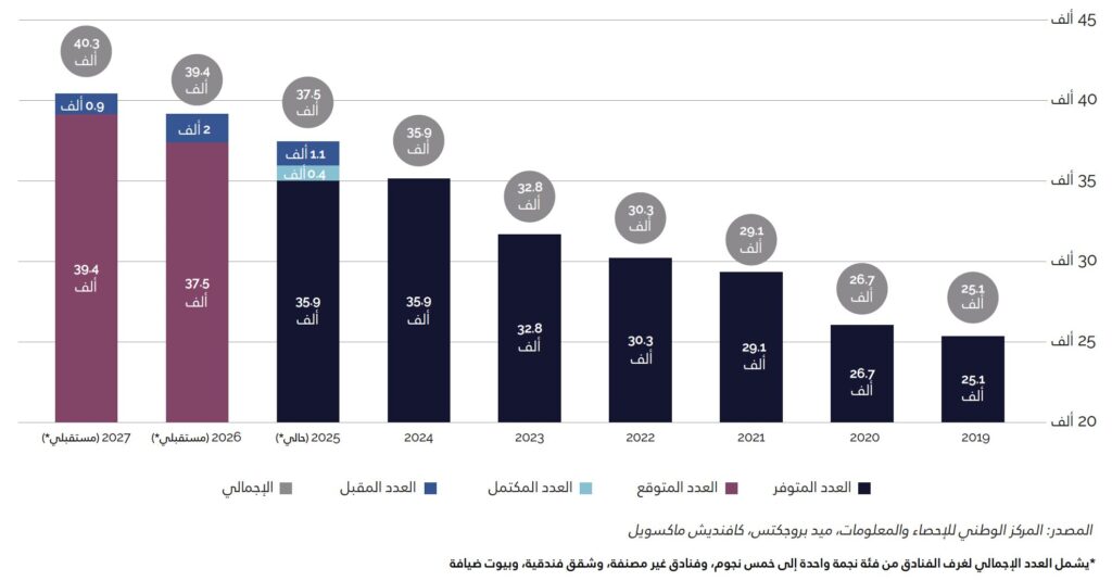 حافظت سلطنة عُﻤﺎن على عدد مستقر نسبياً لغرف الفنادق بلغ حوالي 36,300 غرفة بنهاية سبتمبر 2025 ، مع توقعات بإضافة 1,000 غرفة أخرى بحلول نهاية العام وتأخر إضافة بعض هذه الغرف إلى عام 2026 . وتشﻴﺮ التوقعات إلى وصول إجﻤﺎلي عدد غرف الفنادق إلى حوالي 40,300 غرفة بحلول عام 2027 ، ﺑﻤا يتﻤﺎشى مع النمو المتوقع في قطاع السياحة والمدفوع بالمعاﻟﻢ السياحية الجديدة، وعمليات التطوير التي شهدتها البنية التحتية، ومبادرات الحكومة الرامية إلى زيادة أعداد الزوار. ومن المتوقع أن يواكب هذا الارتفاع التدريجي في العرض تزايد الطلب على الخدمات السياحية، كﻤﺎ سيوفر للزوار خيارات أوسع للإقامة، مﻤﺎ يُسهم في الحفاظ على توازن السوق.