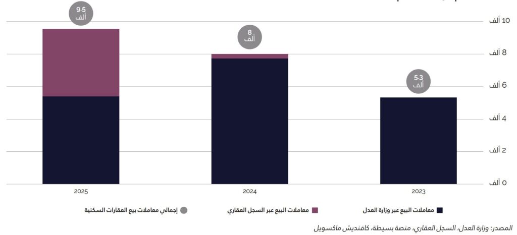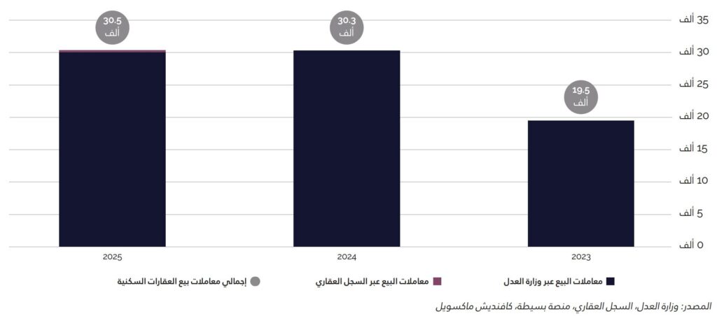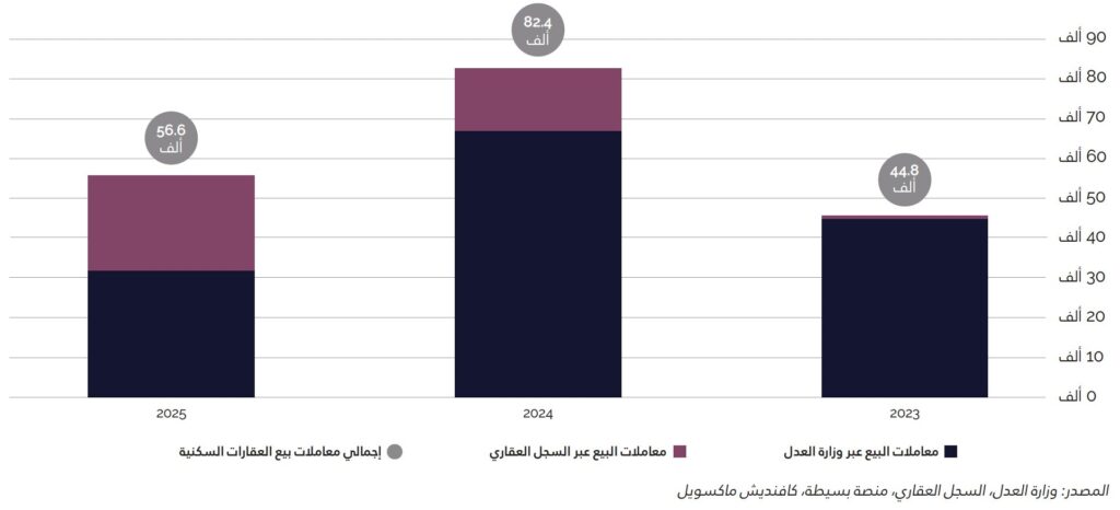 ﺳﺠﻠﺖ اﻟﺮﻳﺎض ﰲ ﻋﺎم 2025 ﻧﺤﻮ 56,600 ﻣﻌﺎﻣﻠﺔ ﺑﻴﻊ ﺳﻜﻨﻴﺔ، ﺑﺎﻧﺨﻔﺎض ﻗﺪره 31.4% ﻣﻘﺎرﻧﺔً ﺑﻌﺎم 2024. وﺗﺮاﺟﻊ ﺣﺠﻢ اﳌﻌﺎﻣﻼت ﺗﺪرﻳﺠﻴﺎً ﻋﲆ ﻣﺪار اﻟﻌﺎم، ﻣﻊ اﻧﺨﻔﺎض ﻣﻠﺤﻮظ ﰲ اﻟﻨﺸﺎط ﺧﻼل اﻟﻨﺼﻒ اﻟﺜﺎﻧﻲ ﻧﺘﻴﺠﺔ ﺗﺮاﺟﻊ زﺧﻢ اﻟﺴﻮق. وﻳﻌﻮد ﻫﺬا اﻟﺘﺒﺎﻃﺆ ﺑﺸﻜﻞٍ رﺋﻴﴘ إﱃ ﻣﺤﺪودﻳﺔ اﻟﻘﺪرة اﻟﴩاﺋﻴﺔ اﻟﻨﺎﺟﻤﺔ ﻋﻦ اﻻرﺗﻔﺎع اﻟﴪﻳﻊ ﰲ اﻷﺳﻌﺎر اﻟﺬي ﺷﻬﺪﺗﻪ اﻟﺴﻨﻮات اﻷﺧﻴﺮة، ﺑﺎﻹﺿﺎﻓﺔ إﱃ ارﺗﻔﺎع ﺗﻜﺎﻟﻴﻒ اﻟﺘﻤﻮﻳﻞ، ﻣﻤﺎ أدى إﱃ اﻧﺨﻔﺎض اﻟﻘﺪرة اﻟﴩاﺋﻴﺔ ﻟﻠﻤﺸﱰﻳﻦ وﺗﺮاﺟﻊ اﻟﻨﺸﺎط اﻟﻌﺎم ﰲ اﻟﺴﻮق.