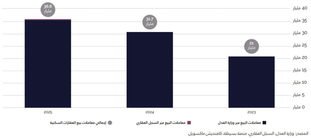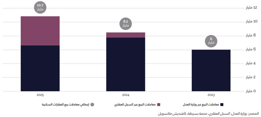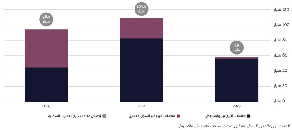 وبلغت قيمة معاملات البيع السكنية في الرياض 96.2 مليار ريال سعودي في عام 2025 ، بانخفاض قدره 12.4 % مقارنةً بعام 2024 . ومع ذلك، استمر متوسط أسعار المعاملات في الارتفاع ليصل إلى 1.7 مليون ريال سعودي، وهو أعلى مستوى مسجل خلال السنوات الأخﻴﺮة.