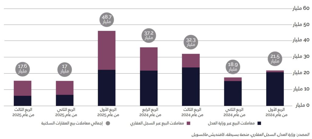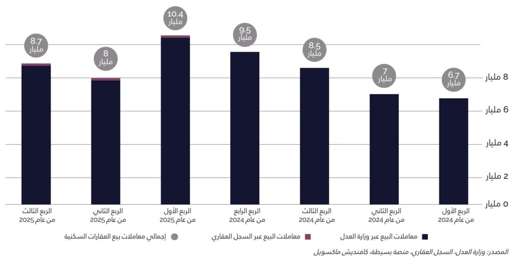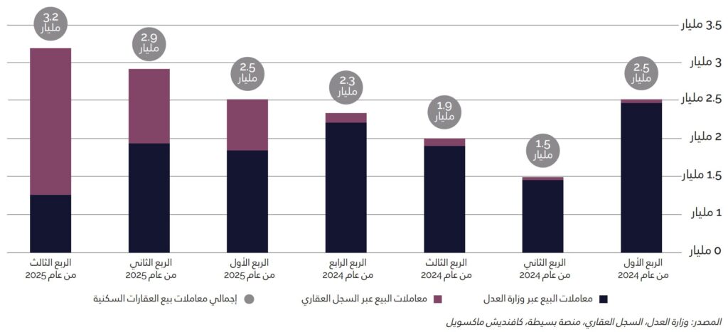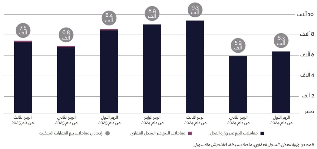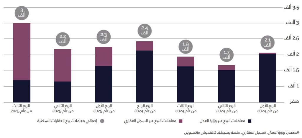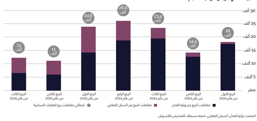 سجلت الرياض حوالي 13,000 معاملة بيع سكنية في الربع الثالث من عام 2025 ، بزيادة 18.7 % عن الربع الثاﻧﻲ للعام نفسه، ما يشﻴﺮ إلى تعافٍ قصﻴﺮ الأمد في نشاط السوق. وسجل حجم المعاملات تراجعاً بنسبة 44.3 % بالمقارنة مع الفترة ذاتها من العام الماضي. ويعود هذا الانخفاض السنوي إلى ضغوطات القدرة الشرائية التي أعقبت الارتفاع السريع للأسعار خلال مرحلة النمو الاستثنائية في عام 2024 ، إلى جانب ارتفاع تكاليف التمويل.