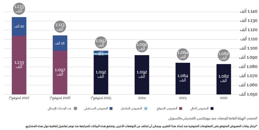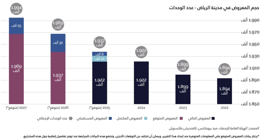 خلال الأشهر التسعة الأولى من عام 2025 ، شهدت الرياض تسليم نحو 10,000 وحدة سكنية، مع توقعات بإضافة 6,000 وحدة أخرى بحلول نهاية العام الجاري. وتحظى العاصمة ﺑﻤحفظة قوية من المشاريع المستقبلية؛ إذ من المقرر تسليم نحو 57,000 وحدة خلال عاميّ 2026 و 2027 ، إلا أنّ المواعيد الفعلية لاستكﻤﺎل المشاريع قد تتأثر ﺑﻤتغﻴﺮات السوق، وتبدّل تفضيلات المشترين، والتأخﻴﺮات المحتملة في عمليات البنا