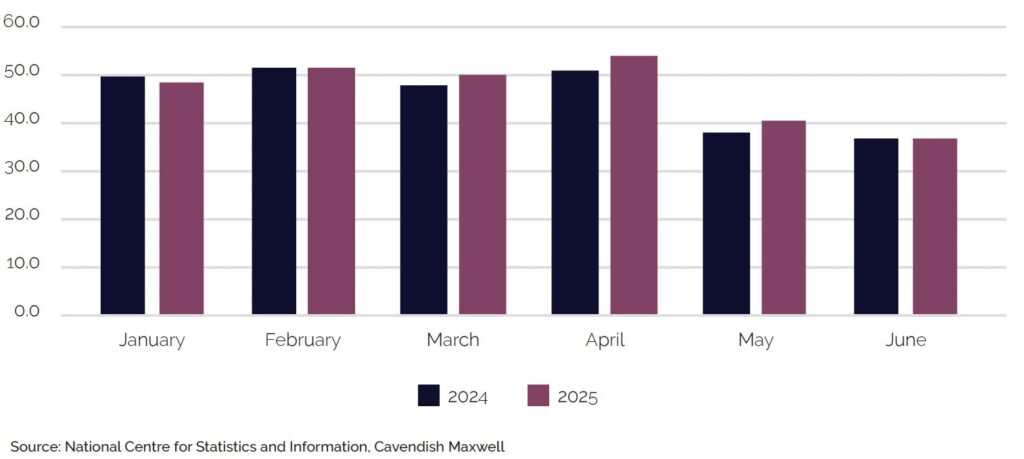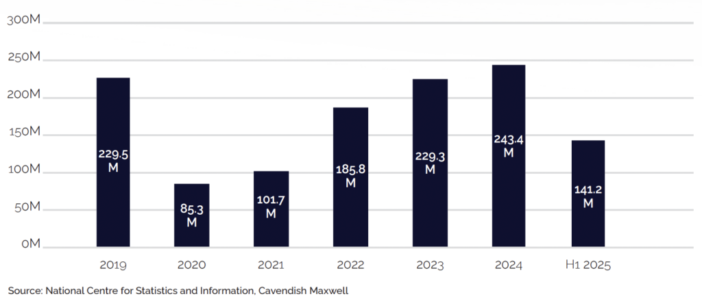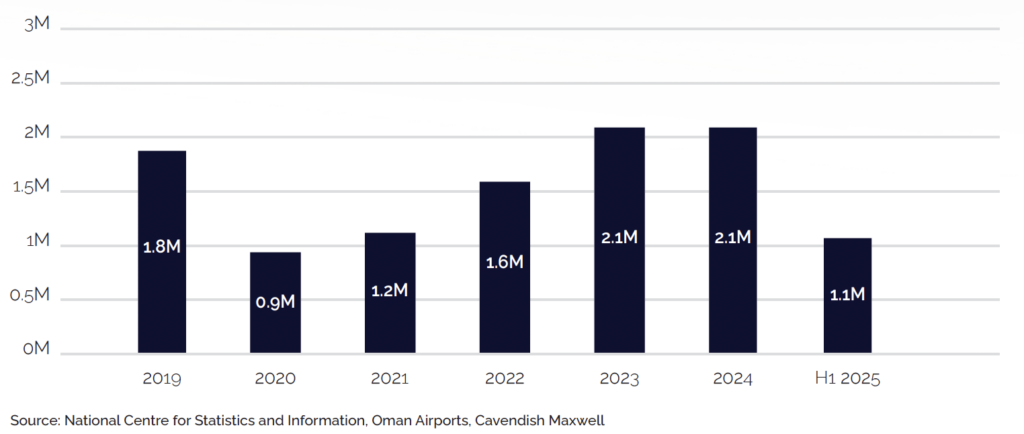 Oman continued to attract a diverse mix of visitors in the first half of 2025 through its range of tourism offerings, from adventure tourism and Meetings, Incentives, Conferences, and Exhibitions (MICE) to rich cultural heritage experiences. These experiences were further supported by Government-led initiatives, including activation programmes and events. As a result, the country’s 3-5-star hotels welcomed approximately 1.1 million guests in H1’2025, up 9.2% from the same period last year, with total guest numbers for 2025 projected between 2.2 and 2.3 million.