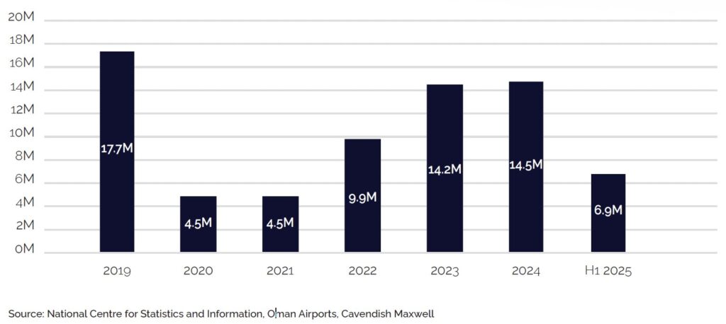 In the first half of 2025, Oman’s four airports handled just over 6.9 million passengers, a 2.2% decline compared to the same period last year. This decrease was primarily driven by lower traffic at Muscat International Airport and Sohar Airport, where passenger volumes fell due to reduced operations. Additionally, temporary airspace disruptions in May and June further contributed to the decline. In contrast, Salalah International Airport recorded an increase in passenger volumes during the same period, supported by strong tourism demand.