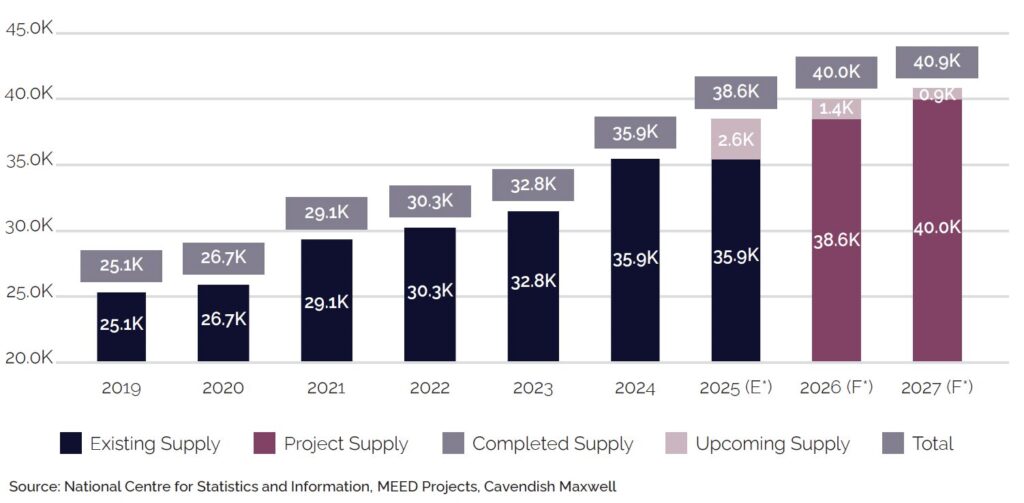 As of H1’2025, Oman’s hotel room supply stood at roughly 36,000 keys, with an additional 2,600 rooms scheduled for completion by year-end, although some are expected to spill over into 2026. Looking further ahead, around 7,000 rooms are in the pipeline between 2026 and 2030. While delivery timelines may shift, the eventual addition of this capacity could temporarily weigh on occupancy levels, particularly in segments with concentrated supply.