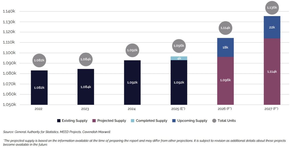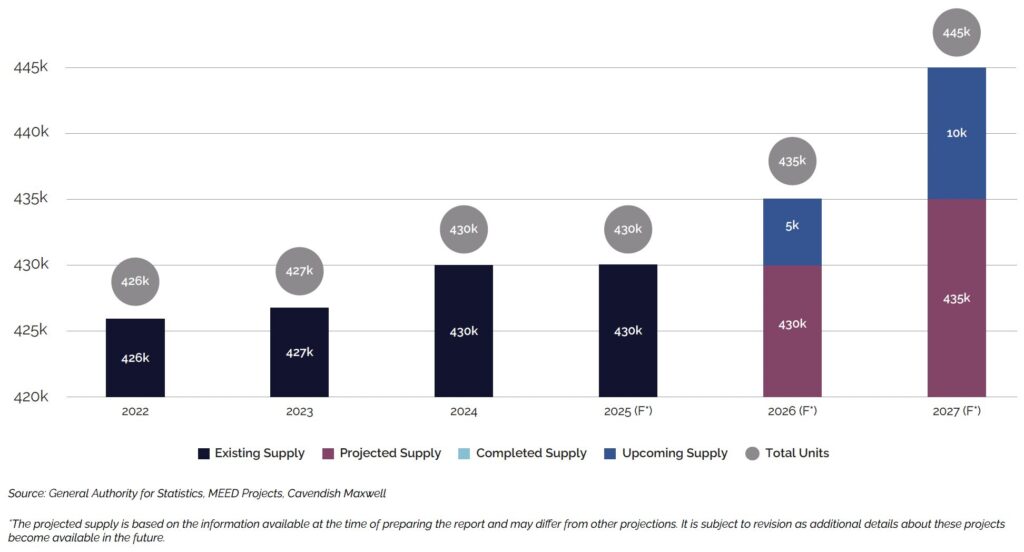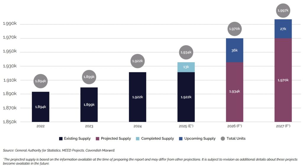 Riyadh’s residential supply continued to expand in 2025, reaching approximately 1.93 million units, with around 13,000 units completed during the year. Deliveries were primarily driven by ROSHN, the National Housing Company (NHC), and the Ministry of Municipal, Rural Affairs and Housing (MOMRAH), among others. Looking ahead, the capital’s residential pipeline remains robust, with approximately 63,000 units scheduled for delivery across 2026 and 2027, predominantly through NHC and ROSHN-led projects. However, actual completions are likely to fall short of projected figures, as evidenced by delivery trends observed in 2025.