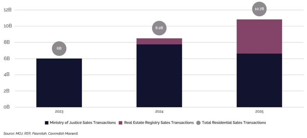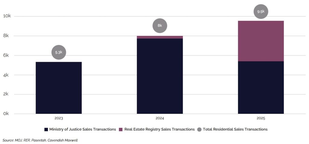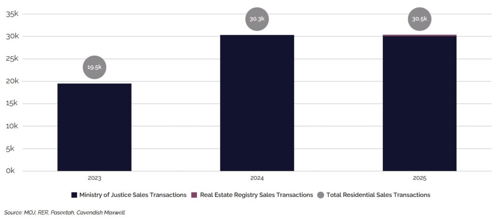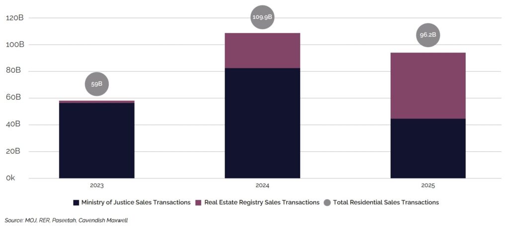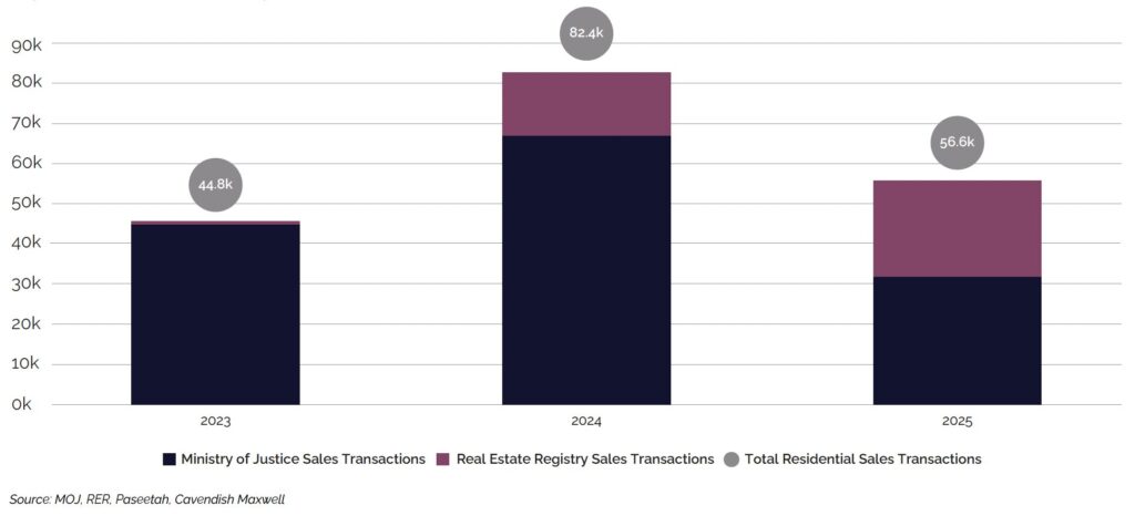 Saudi Arabia’s three major residential markets delivered divergent performances in 2025. Riyadh recorded approximately 56,600 transactions, down 31.4% year-on-year, as affordability constraints and elevated financing costs dampened buyer activity. Despite the decline in transaction volumes, average transaction prices reached SAR 1.7 million, the highest level in recent years, with apartment and villa prices appreciating 6.6% and 9.7%, respectively. The rental market remained strong throughout the year, ultimately prompting the Government to introduce a five-year rental freeze in late September 2025.
