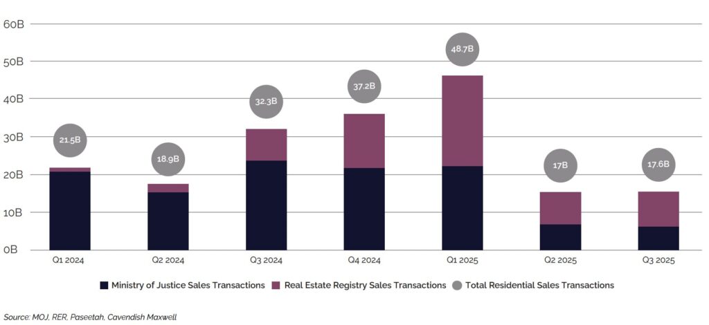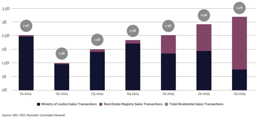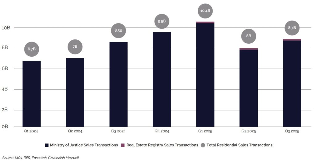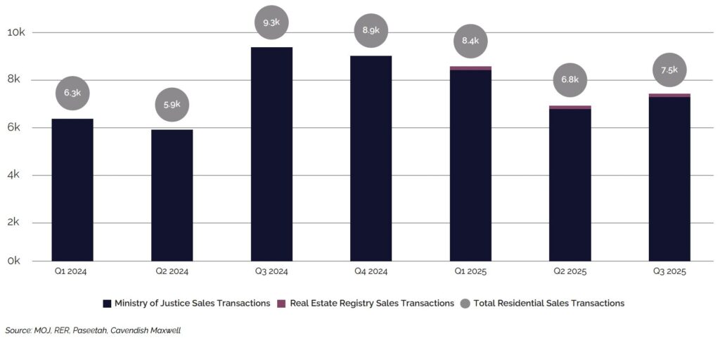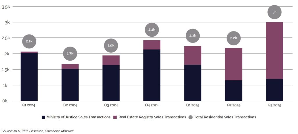 Jeddah’s residential market demonstrated an uptick in Q3 2025, with transaction volumes increasing 10.3% to reach approximately 7,500 sales transactions. This recovery coincided with stabilising price conditions, which appeared to support renewed buyer activity as affordability pressures eased slightly.
