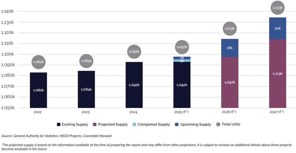 In the first nine months of 2025, Riyadh delivered approximately 10,000 residential units, with a further 6,000 units expected by year-end. Looking ahead, the capital’s residential pipeline remains strong, with around 57,000 units scheduled for delivery across 2026 and 2027. However, actual completions may be impacted by shifting market dynamics, evolving buyer preferences, and potential construction delays.