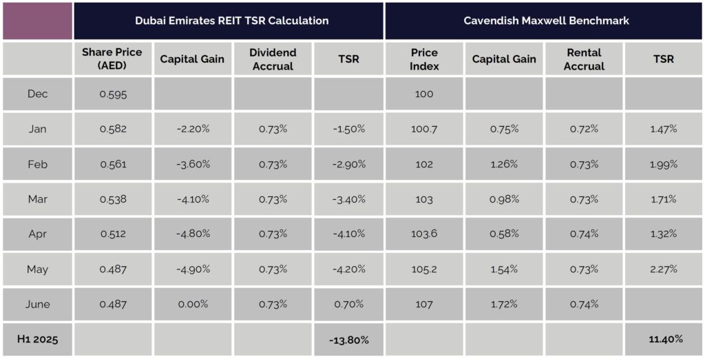 How are UAE and Saudi REIT investors faring? Would they have been better off investing in physical real estate? The first part of answering this question is to determine how we should compare REITs with physical property from an investment standpoint. The most logical way is to imagine we start with AED1m invested in the Emirates REIT at the end of December 2024 and see what we arrive at after the first half of 2025 by comparison to investment in physical residential real estate in Dubai. For the capital values part of the calculation, we can use the monthly share price of the Emirates REIT and, for comparison, commercial real estate prices and rents for Dubai derived from Cavendish Maxwell data. For the rental part, given that both REITs and physical property will return cash in the form of dividends and rents respectively, we can compare REIT dividends with Cavendish Maxwell rental estimates. By contrast we do receive rents monthly so we should add to the Property Monitor monthly rental index the monthly equivalent of 5%. Having selected Cavendish Maxwell data as the benchmark and made these assumptions, we can now generate the comparative model depicted in the table below.