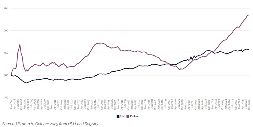 Everyone knows that housing and commercial property prices move in cycles. The pattern of a long-sustained build-up in asset prices followed by a sudden decline has been observed in Organisation for Economic Co-operation and Development (OECD) countries for decades. It is also known that real estate returns are generally more stable in the years between peaks and troughs. Not all cycles, however, are equally severe, nor are markets equally volatile. For example, comparing what has happened in Dubai since 2021 with UK average prices clearly indicates how much more volatile this Gulf market has been. And, of course, Dubai has seen much more impressive house price growth in recent years: when both markets are indexed to January 2008 = 100, UK prices stand at 158.3 while Dubai reaches 233.7.