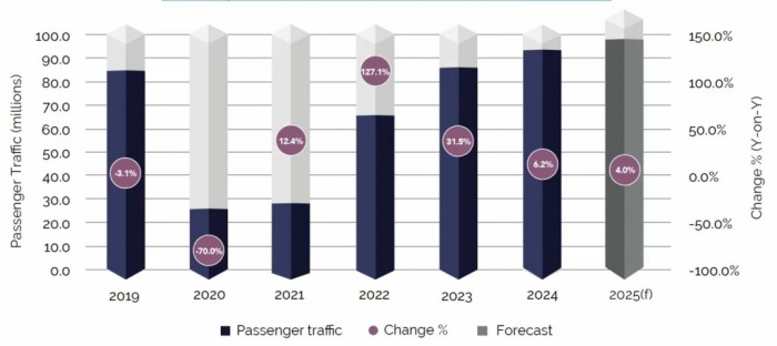 In the first half of 2025, Dubai International (DXB) handled 46 million passengers, a 2.3% year-on-year increase. Despite temporary airspace disruptions in May and June, the airport posted its busiest first half on record, driven by its extensive connectivity to more than 260 destinations across 107 countries.